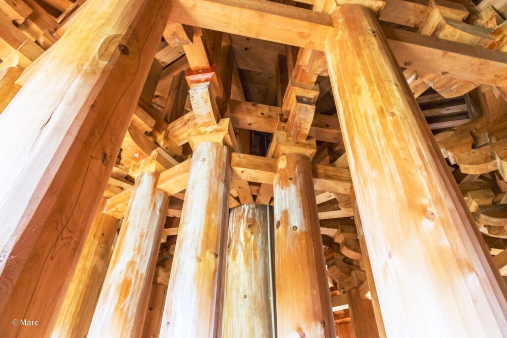 現在の建物は1990年代に考古学的調査や文献に基づいて復元されたもので、八角形平面の多層建築という極めて珍しい形式を採用しています。