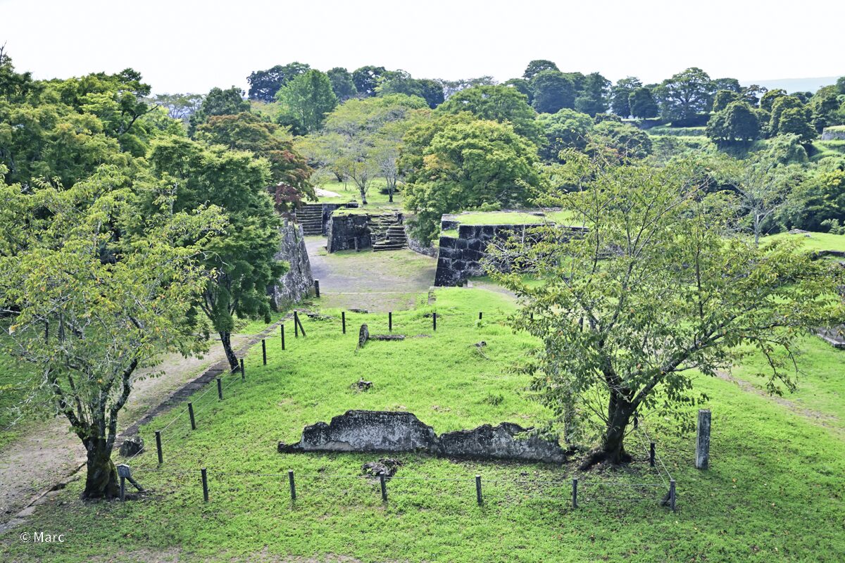 本丸周辺から見渡すと、石垣と緑が調和した開放的な景観が広がり、往時の城郭規模の大きさを実感できます。