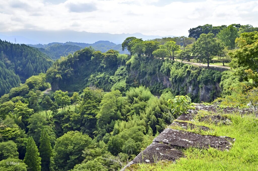 外縁部に立つと眼下には深い谷と豊かな山並みが連なり、まさに天然の要害と呼ぶにふさわしい地形であることがわかります。